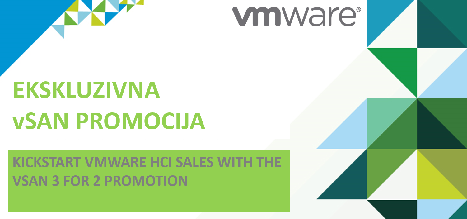 Kako bismo vam pomogli da stvorite dodatne potencijalne korisnike za hyper-converged infrastructure – HCI uz VMware vSAN™, sa zadovoljstvom objavljujemo novu VMware promociju vSAN 3 za 2. Tokom promocije možete klijentima da ponudite 3 noda vSAN softvera vSAN po ceni 2 (6 vSAN standardnih CPU licenci po ceni 4) putem promotivnog SKU. Kompletne detalje potražite u na LINK-u.